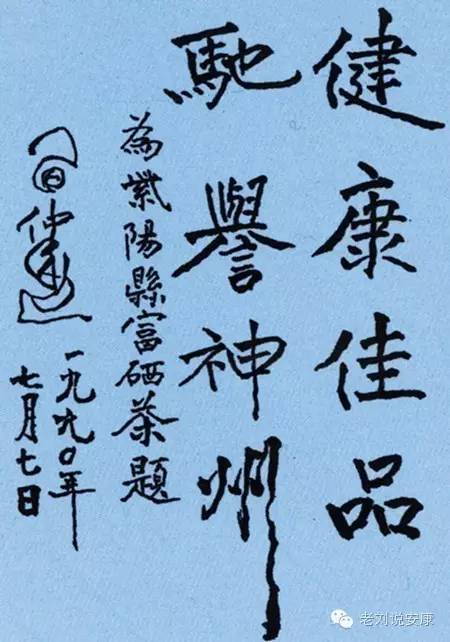 这次,她欣然挥笔,为紫阳富硒茶题词:“紫阳茶富硒、抗癌、色香味具佳,系茶中珍品”。
